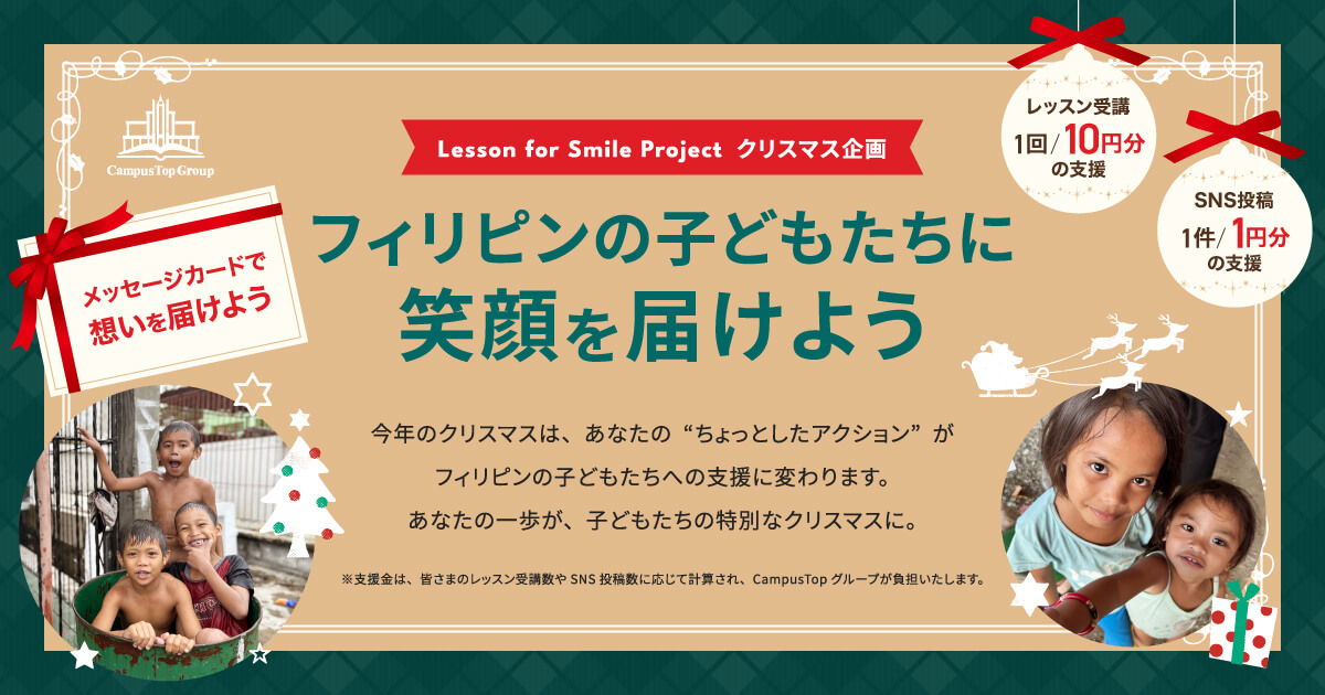 QQキッズ 今年のクリスマス企画 「フィリピンのこどもたちに笑顔を届けよう」 レッスン受講1回で10円の支援SNS投稿1回で···